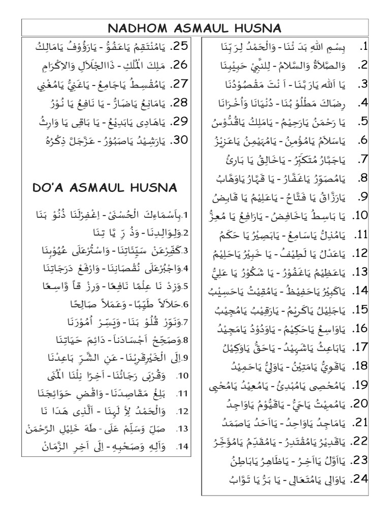 Nadhom asmaul husna merupakan syair yang di gunakan untuk memanjatkan atau melafalkan asmaul husna dari allah.