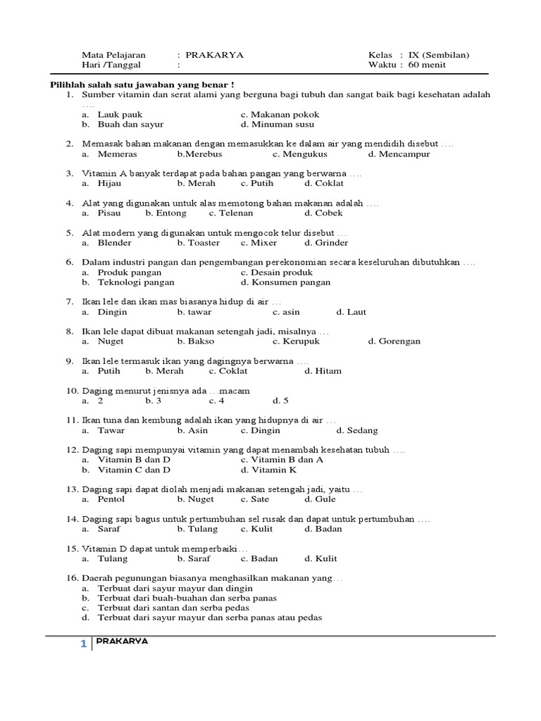 Ketujuh postingan admin kali ini berisikan soal prakarya tentang pengolahan bahan makanan awetan dari bahan pangan hewani. Pempek dan tekwan merupakan makanan khas dari daerah. Ujian praktek prakarya dan kewirausahaan 1. 3.2 mengidentifikasi sumber daya yang dibutuhkan dalam mendukung. Salah satunya adalah ujian madrasah atau ujian sekolah mata pelajaran prakarya yang juga harus ditempuh oleh peserta didik sesuai dengan tuntunan kurikulum 2013.